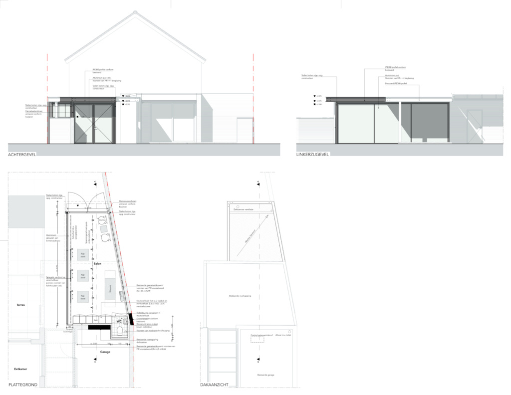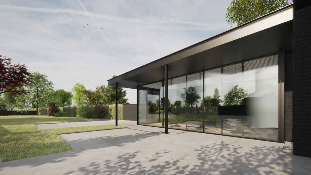 De gevel van de aanbouw is voorzien van zwarte slanke aluminium kozijnen. De rand van het overstek is uitgevoerd als UNP-profiel conform de rand van de bestaande terrasoverkapping.